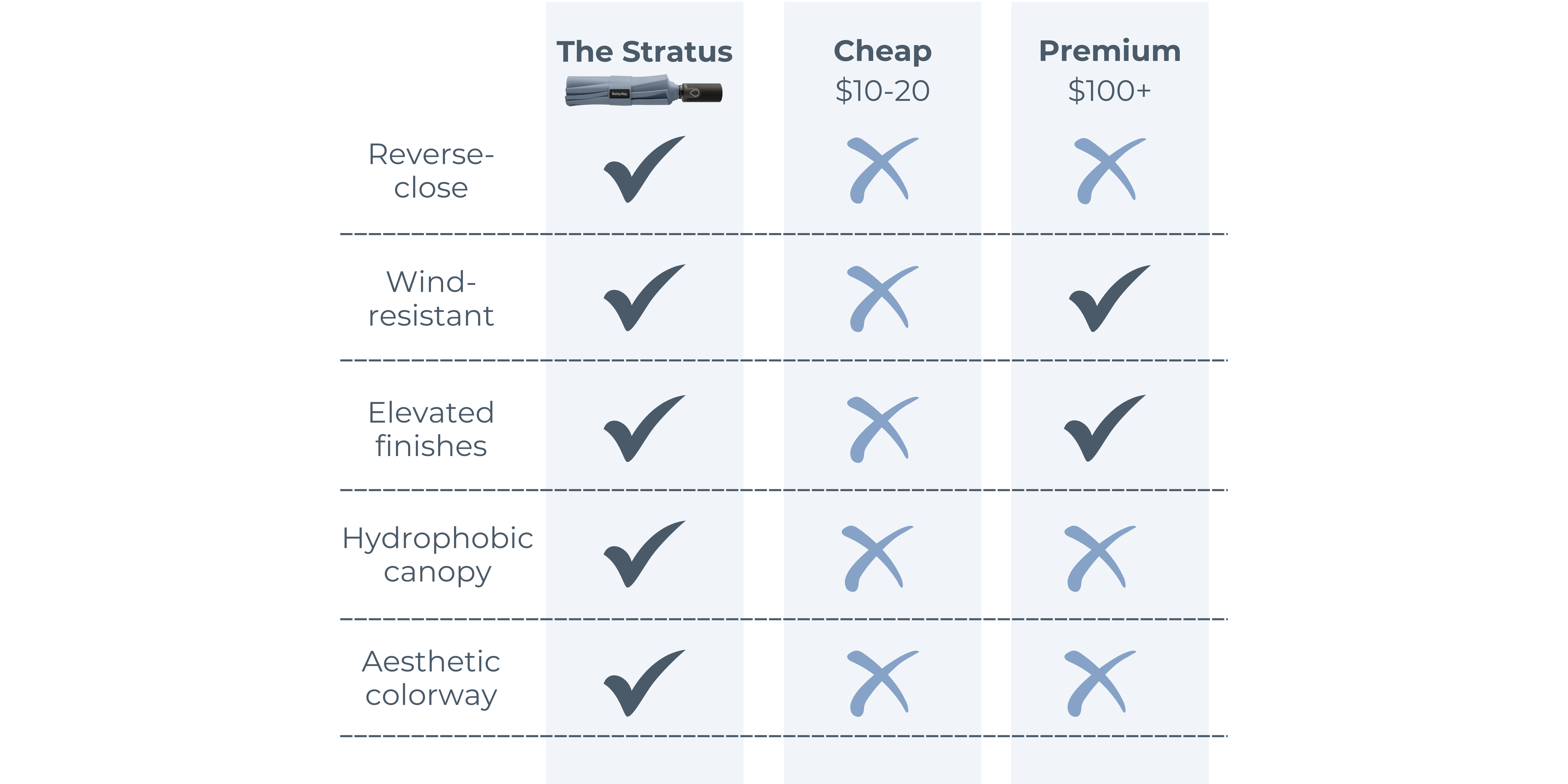 The Stratus is our compact umbrella—perfect for travellers, commuters, and people on-the-go. Its small frame structure enables the umbrella to close down to just 7 inches, while still providing durable protection with reinforced fiberglass. Attention to detail was infused into every step of the design process, from the vegan leather crafted handle and embroidered logo, the included neoprene carrying case to keep your other personal items dry, and color options to complement any outfit.
